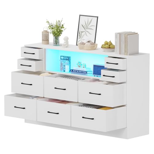 TRIOBLADE Chest of Drawers 10 Fabric Drawers Cabinet with Wood Top Dresser with 16 Color LED Lights Large Storage Cabinet Sturdy Storage Organizer with Handle for Bedroom Living Room (White)