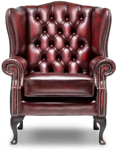 ANGEL HOME & LEISURE New Queen Anne Fireside High Back wing back leather chair Chesterfield type armchair (Black) (ox blood)