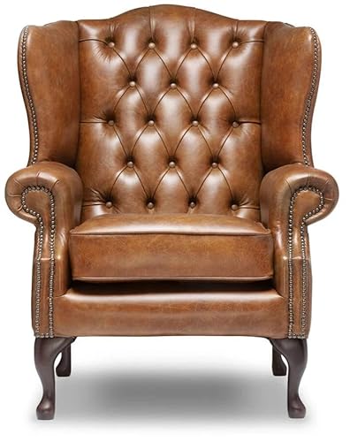 Queen Anne Chesterfield Chair | 100% Genuine Brown Leather | High Back Wing Armchair with Mahogany Legs | Traditional Vintage Lounge Chair (Brown)