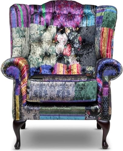 Chesterfield Queen Anne Chair Patchwork Velvet | Classic Chesterfield Design, Handcrafted in the UK | Comfortable & Elegant | Premium Velvet Upholstery, Queen Anne Legs