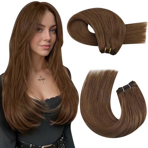 Moresoo Weft Hair Extensions Real Human Hair Light Brown 18 Inch Sew in Human Hair Extensions Chestnut Brown for Women Remy Silky Straight Hair 100G/Pack #8