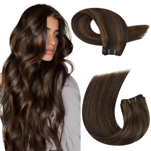 Moresoo Weft Human Hair Extensions 22 Inch Double Weft Hair Extensions Real Human Hair Balayage Darkest Brown and Chestnut Brown Double Weft Sew in Extensions 100g/Pack #2/6/2