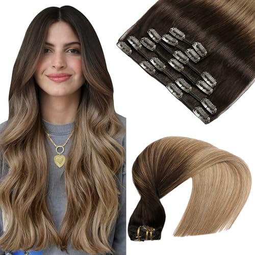 VINBAO Extensions Real Human Hair Clip in Balayage 100g 16 Inch Dark Brown To Chestnut Brown Highlight Ash Blonde Hair Extensions Clip in Real Hair 100g Double Weft (#C2/6/18,16'')
