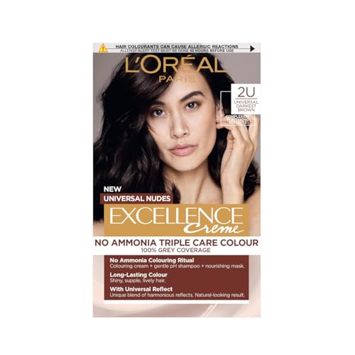 L’Oréal Excellence Permanent Hair Dye Colouring Cream, 100% Grey Coverage, With Pro-Keratin + Ammonia-Free, Universal Nudes, 2U Darkest Brown