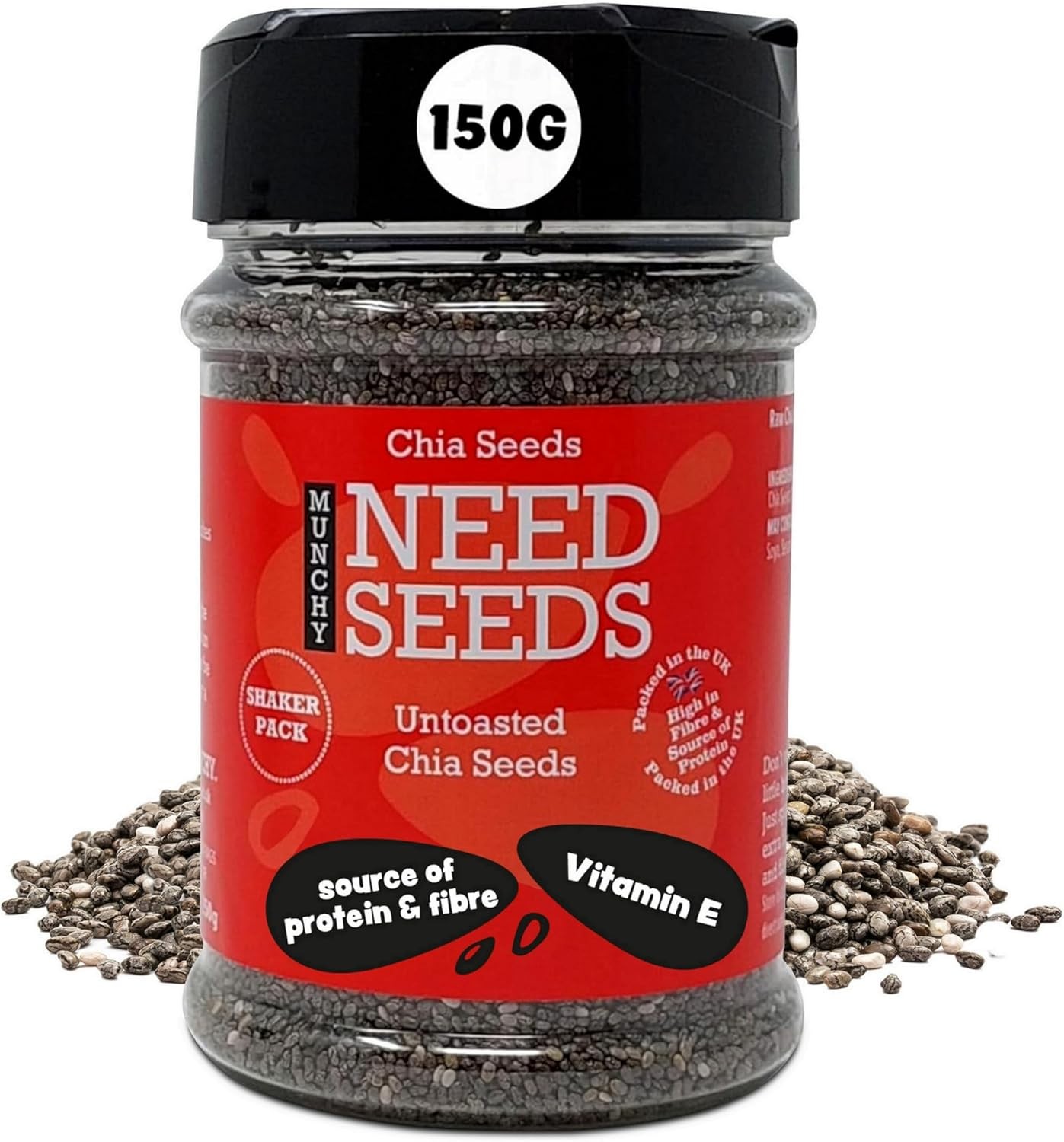 Chia Seeds 150g Shaker – Rich in Omega-3, Protein & Fiber – Supports Energy & Digestion – Vegan & Gluten-Free – Perfect for Smoothies, Yogurt, Oatmeal & Baking – Munchy Seeds, Need Seeds