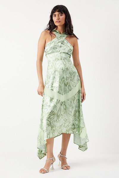 Warehouse Snake Print Satin Cross Front Chiffon Insert Hanky Hem Midi Dress