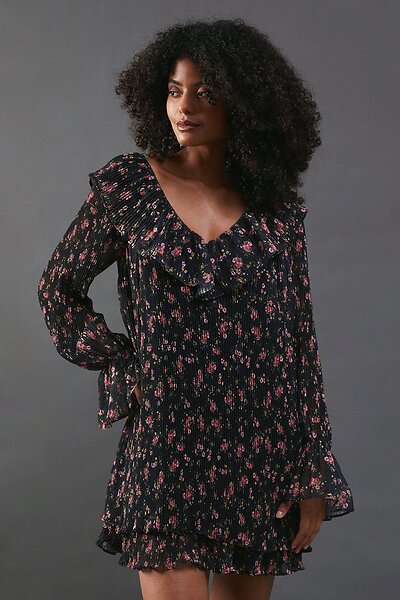 Warehouse Floral Pleated Chiffon V Neck Mini Swing Dress
