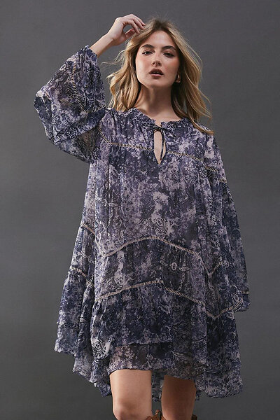 Warehouse Chiffon Faded Paisley Ladder Insert Ruffle Smock Mini Dress
