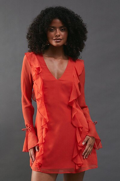 Warehouse Chiffon Ruffle Detail Tie Sleeve Mini Dress