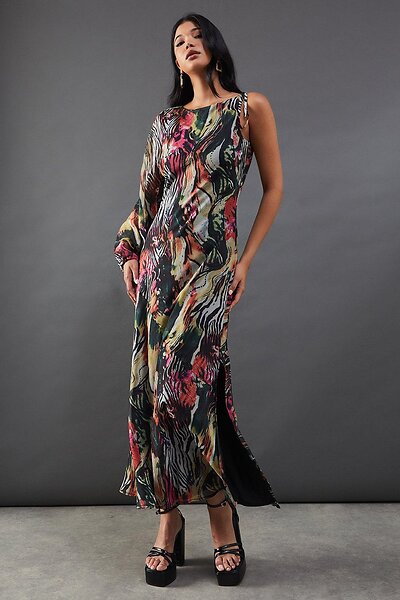 Warehouse Chiffon Printed One Shoulder Split Front Maxi Dress