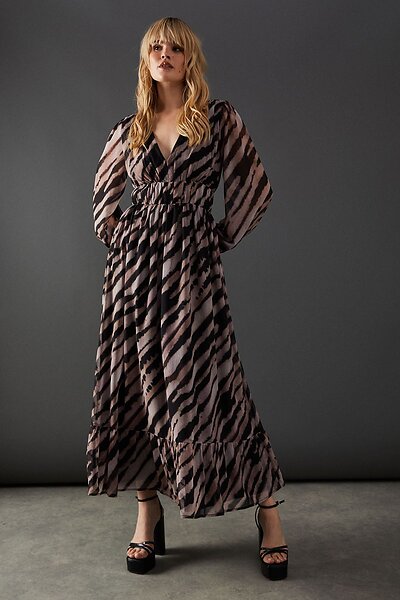 Warehouse Animal Chiffon Plunge Neck Balloon Sleeve Maxi Dress