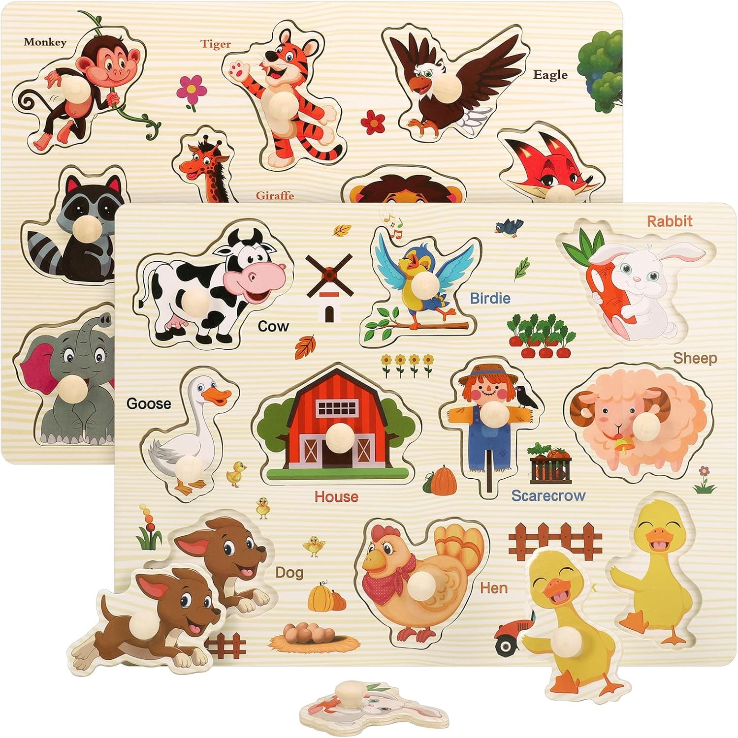 2 Set Wooden Puzzles for Kids 3-6 Year Olds, Chunky Child Farm Animals Peg Puzz