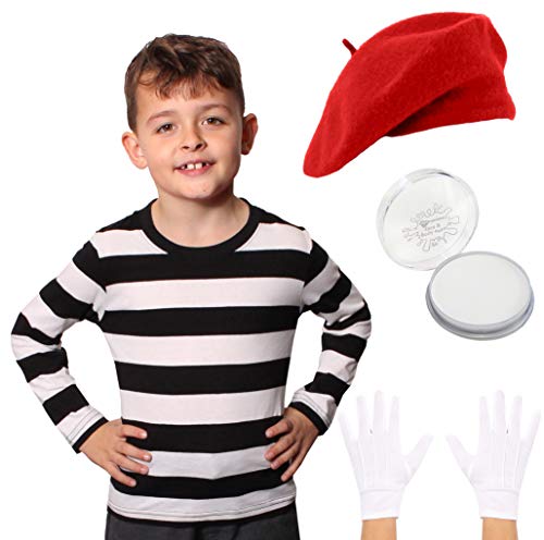 Child's French Mime Fancy Dress Costume School Curriculum Book Week Set Black Stripy T-shirt With Black Beret Kid's White Gloves and White Face Paint Size Large
