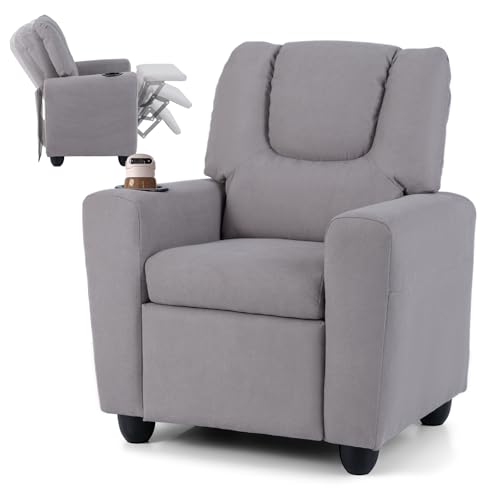 COSTWAY Kids Recliner Chair, Adjustable Children Armchair Sofa with Cup Holder, Footrest, Toddler Gaming Lounge Chair for Boys Girls (Fabric, Grey)
