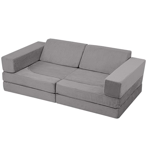 MeMoreCool 10-Pieces Kids Play Sofa, Corduroy Modular Toddler Chair Couch for Playroom, Fold Out Foam Couch for Girls Boys, Convertible Armchair Children Sectional Playset, Light Grey