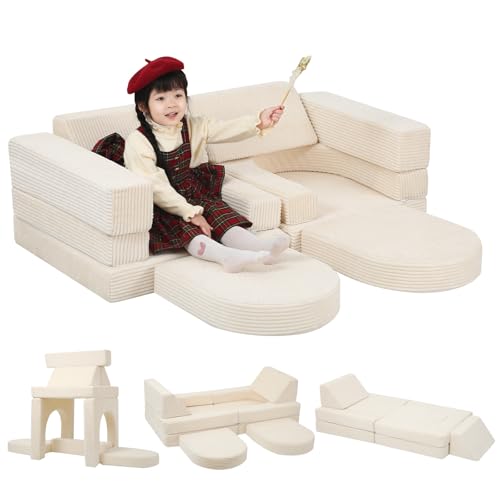 MeMoreCool Kids Play Sofa, 10-Pieces Corduroy Modular Toddler Chair Couch for Playroom, Fold Out Bed Foam Couch for Girls Boys, Convertible Armchair Children Sectional Playset, Beige