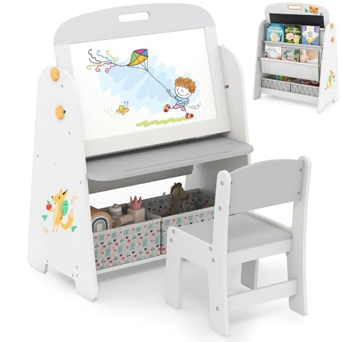 GYMAX Kids Art Table and Chair Set, Double-Sided Toddler Easel with Whiteboard & Blackboard, Fabric Bins and Bookshelf, 4-in-1 Children Activity Table and Chair Set for Boys Girls (White+Grey)