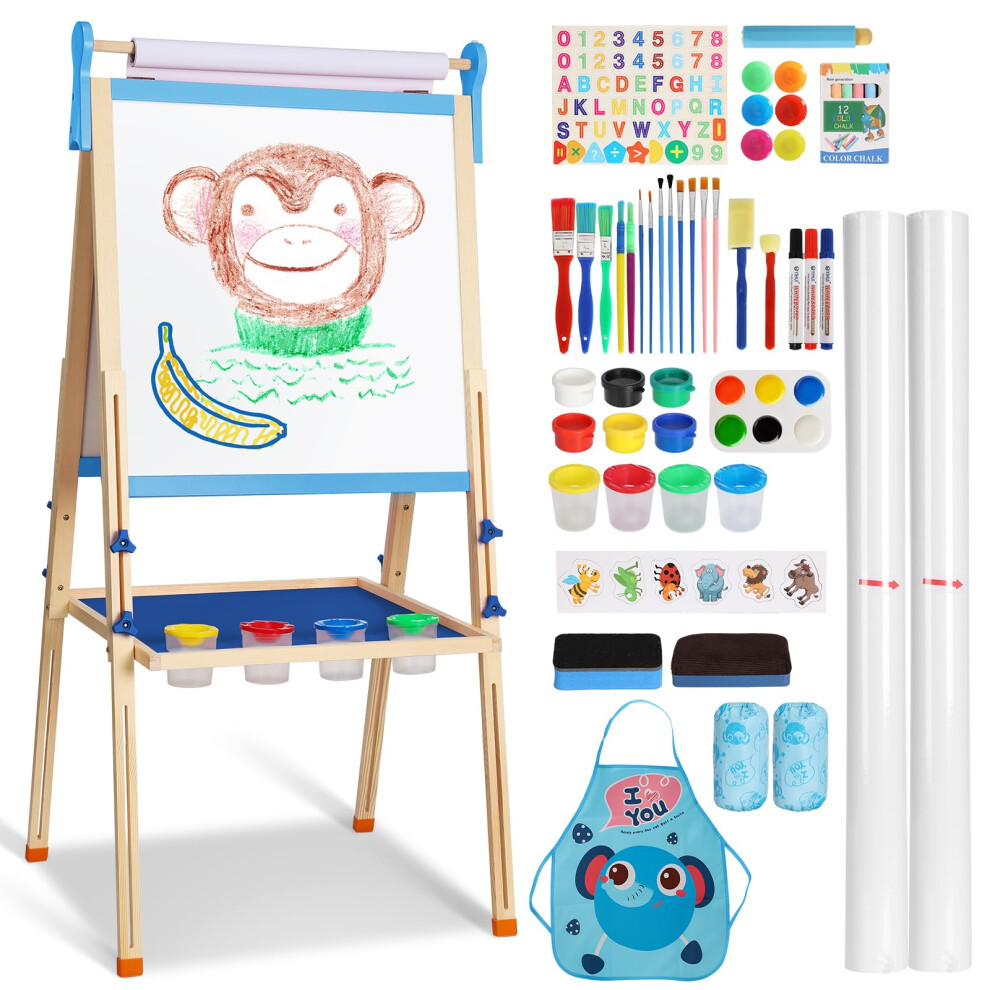 YOHOOLYO Kids Easel Wooden Children Art Easel Paper Roll Double Sided Magnetic Whiteboard Chalkboard Dry Eraser Adjustable Height for Boys Girls Gifts