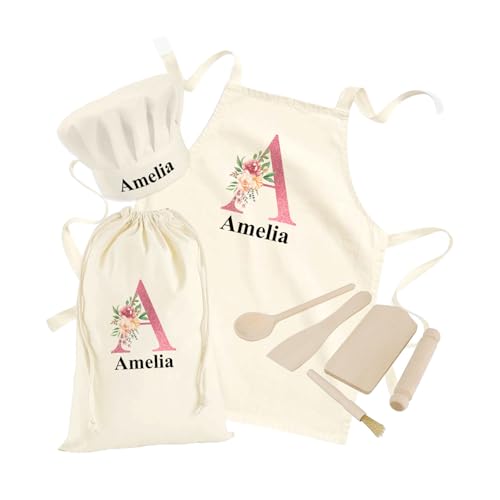 Hoolaroo Personalised Kids Aprons Age 6-12 For Cooking Childrens Baking Gifts Personalised Apron Kids Cooking Utensils Set Wooden - Pink Letter Design