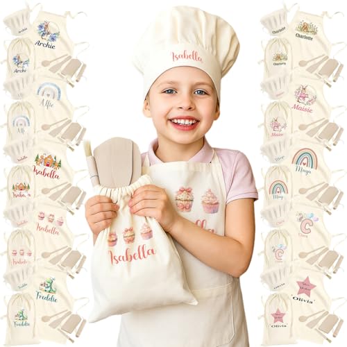 Personalised Kids Aprons For Girls Cooking Childrens Baking Gift Set Custom Apron Hat Kids Cooking Utensils Wooden Tools Pink Cupcake