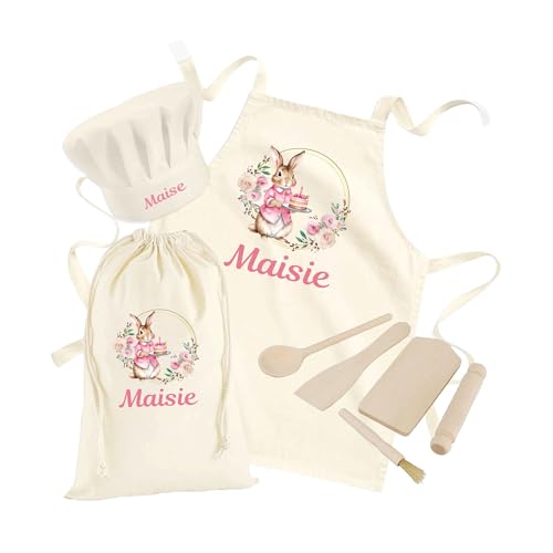 Hoolaroo Personalised Kids Aprons For Cooking Childrens Baking Gifts Personalised Apron Kids Cooking Utensils Set Wooden (Pink Bunny)