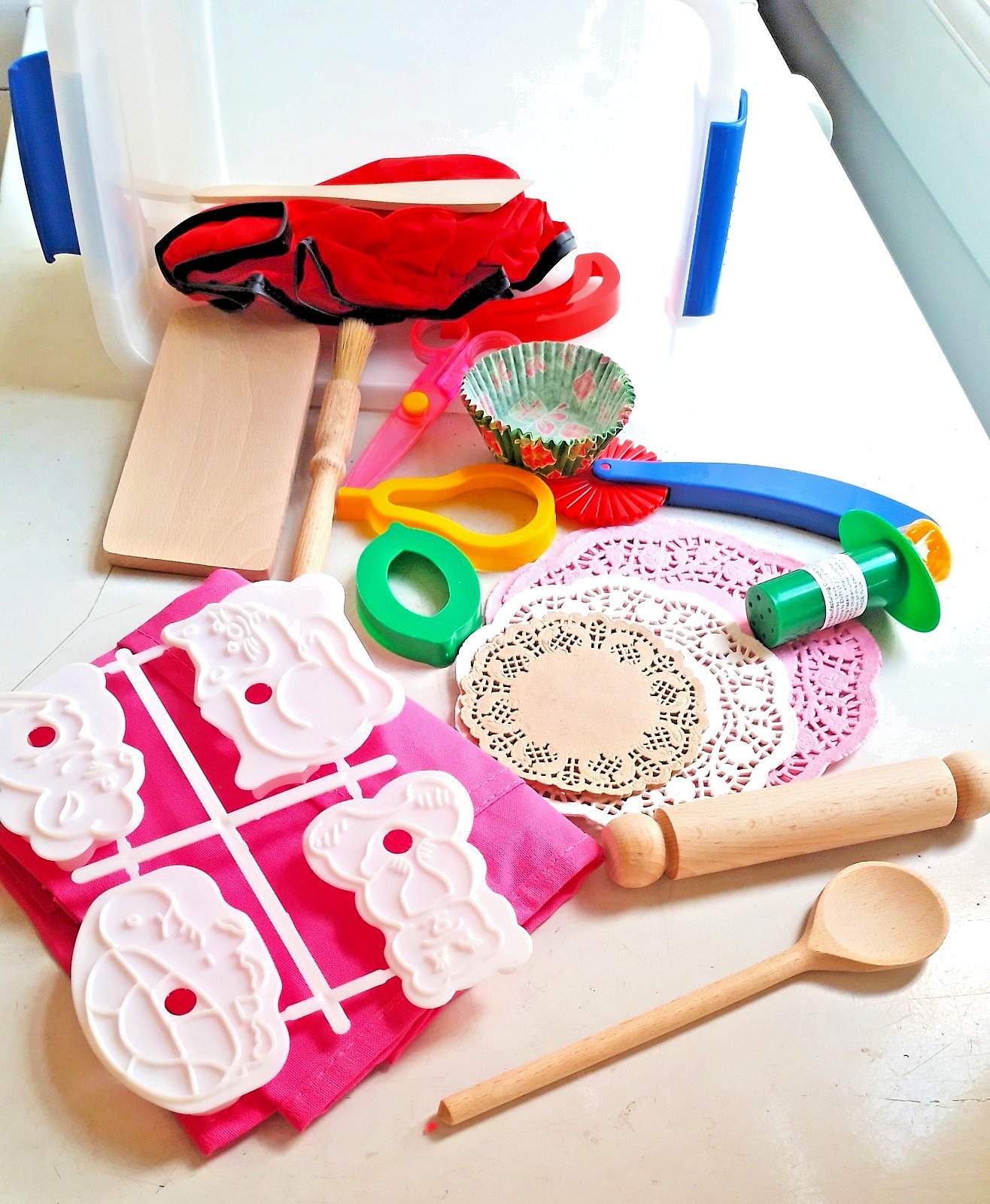Childrens Baking Set Apron Hat Wooden Utensils Cutters Doilies Bun Cases in Tub