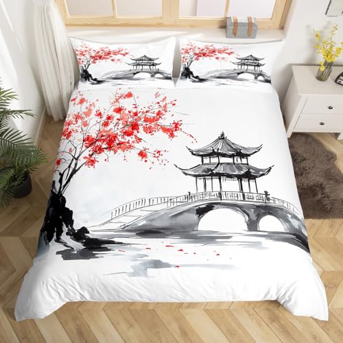 Loussiesd Japanese Ukiyo-E Bed Sheet Set Sakura Maple Leaf Down Duvet Set Double Children's Boys and Girls Ink Japanese Bed Cover Style Landscape Painting Style Bedding Set