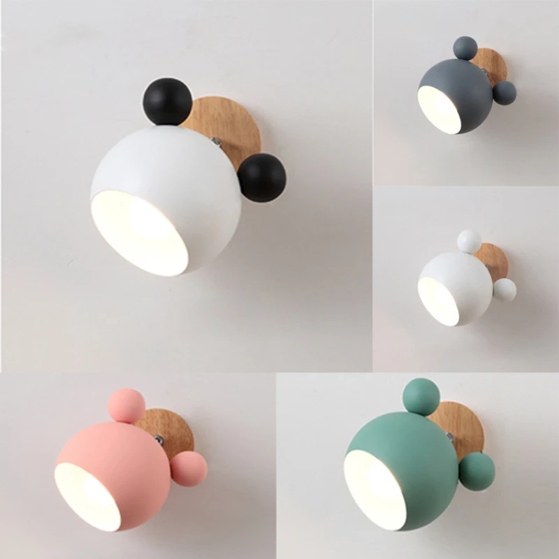Nordic Creative Macaron Simple Personality Bedroom Mickey Cartoon Warm Children's Room Bedside Lamp Wooden Wall Lamp