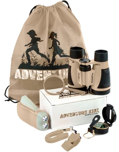 Adventure Kidz Tan Outdoor Exploration Kit, Children’s Binoculars, Flashlight, Compass, Fox Whistle, Magnifying Glass, Backpack. Great Gift Set for STEM, Pretend Play