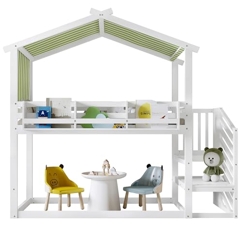 ModernLuxe Children's Bunk Bed with Decorative Canopy, 3ft Teen Bed with Corner Staircase, MDF & Pinewood, White & Green, 90x190cm, Space-Saving Design with Picture Bookshelf - No Matress