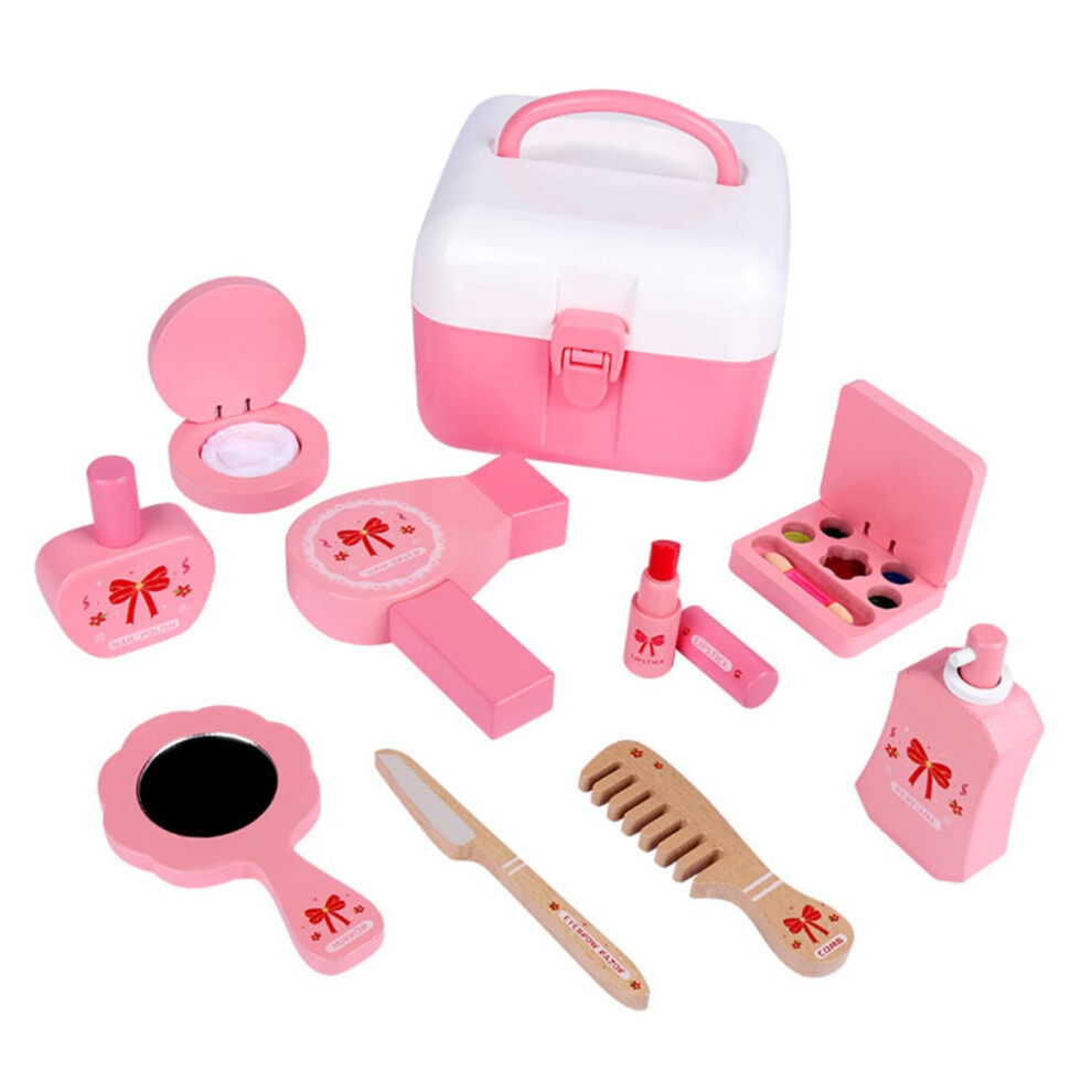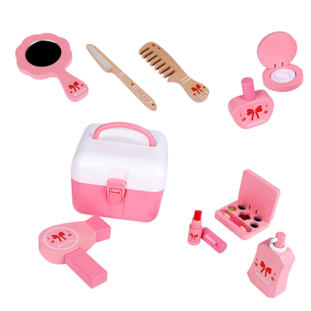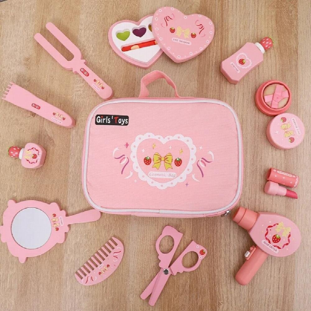 Wooden Girls Makeup Set Pink Make Up Bag Toy Wood Simulation Cosmetic Handbag Pretend Play Toys For Girl Childrens