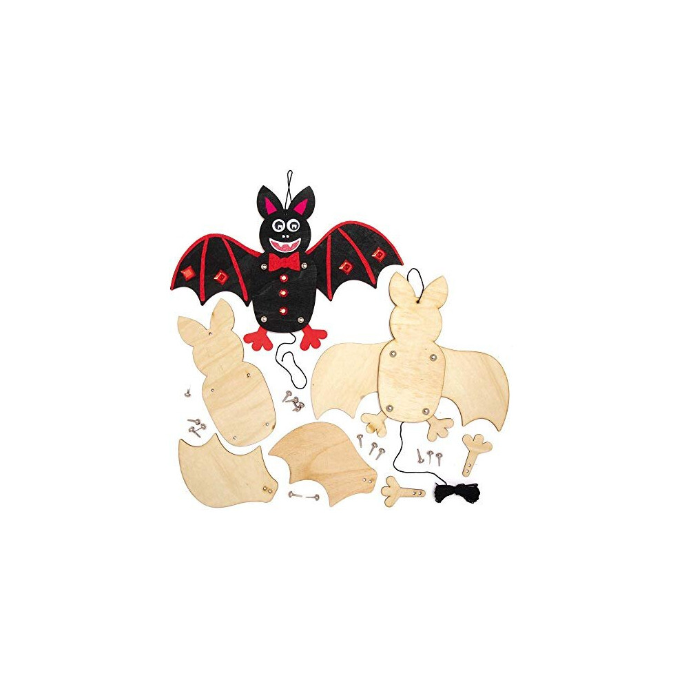 Baker Ross AX195 Halloween Bat Wooden Puppet Craft Kits - Pack of 4, Childrens Woodcraft Painting, Make Your Own, Crafts for Kids