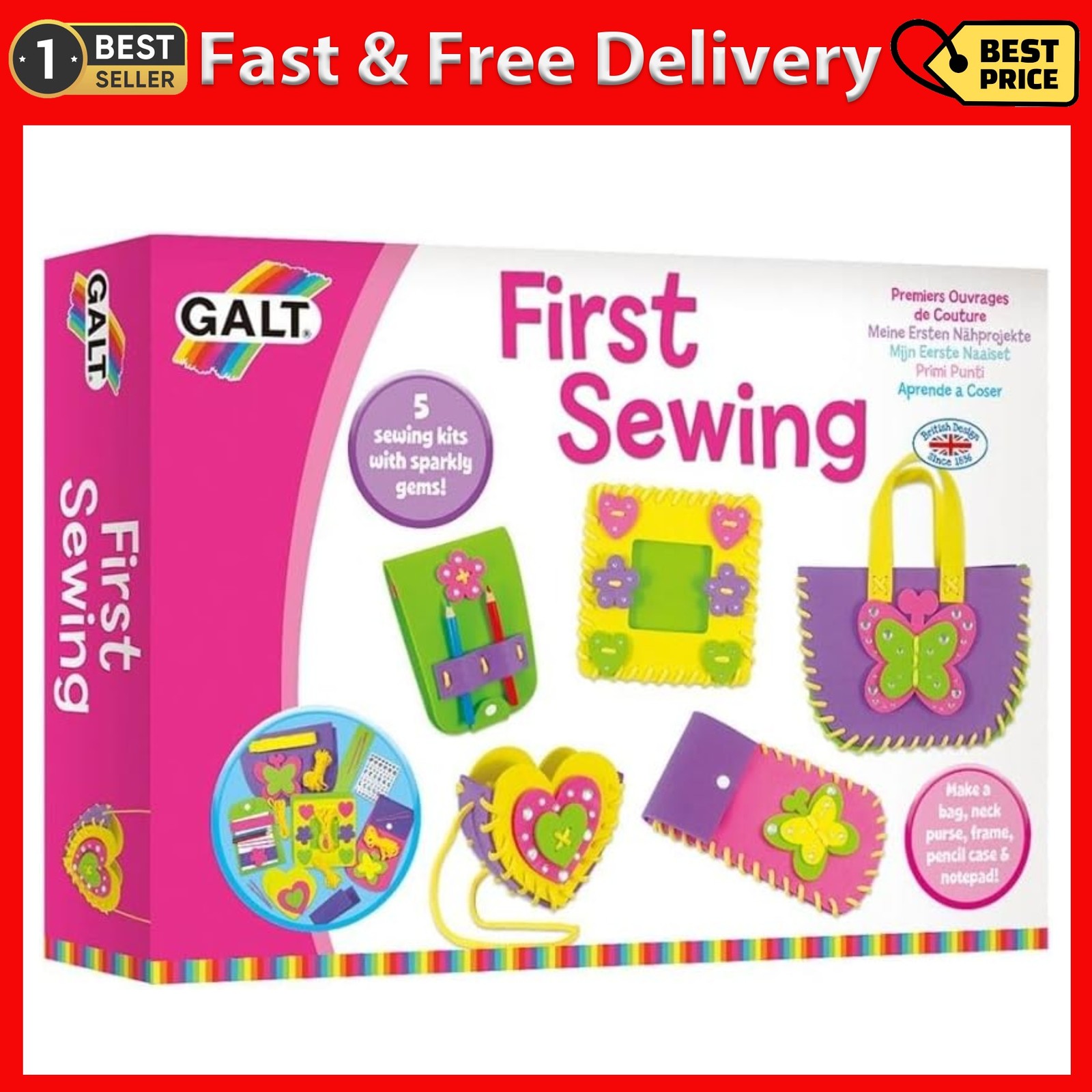 Galt First Sewing Kit - 5 Childrens Sewing Kits, Craft Kit for Kids - Introduction to Sewing, Colourful Learn to Sew Set - Step by Step Guide - Make a Bag, Frame, Purse and More - Ages 5 Years Plus