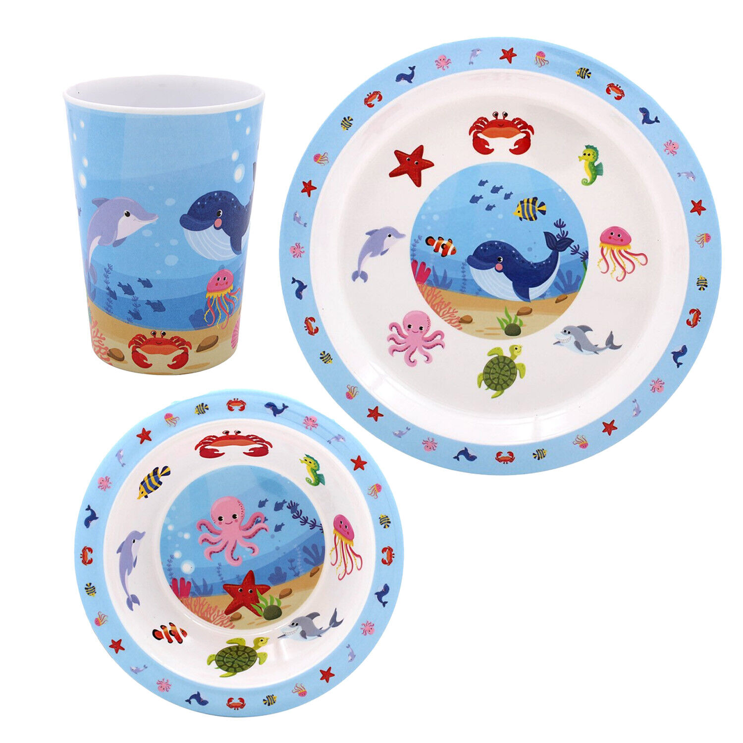 Kids Dinner Set 3pc Blue Sea Life Aqua Animals Childrens Bowl Meal Toddler Plate