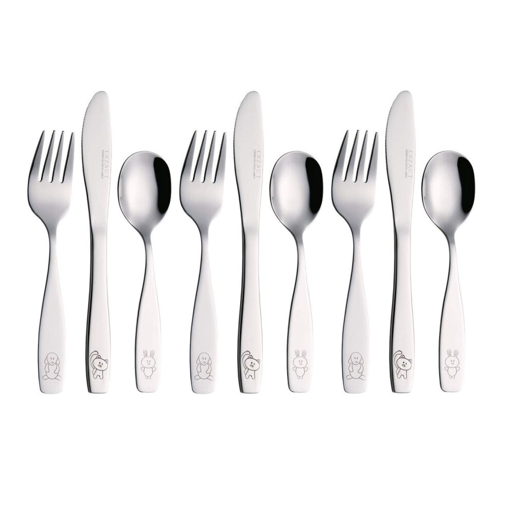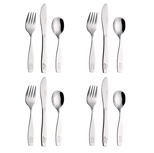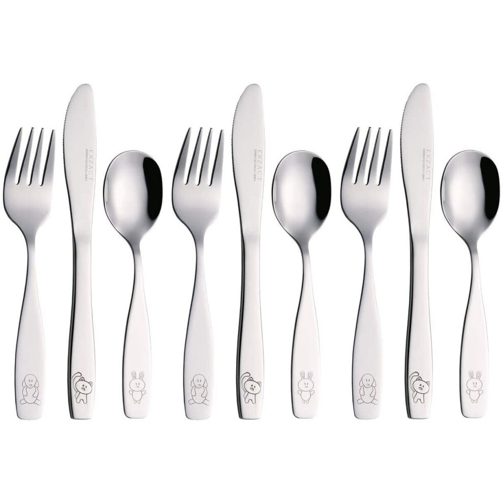 Exzact Children's Cutlery 12pcs Set Stainless Steel/Kids Cutlery - 4 x Forks, 4 x Safe Dinner Knives, 4 x Dinner Spoons - Engraved Dog Cat Bunny Design