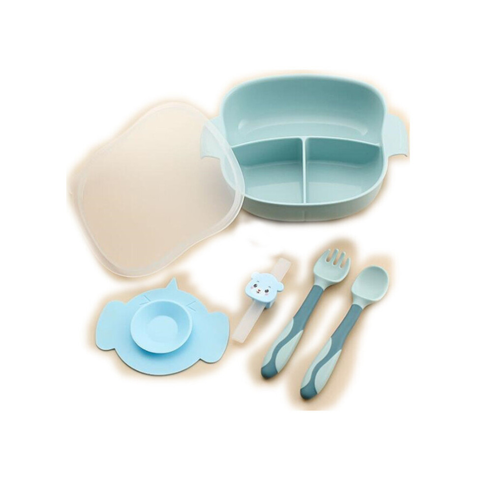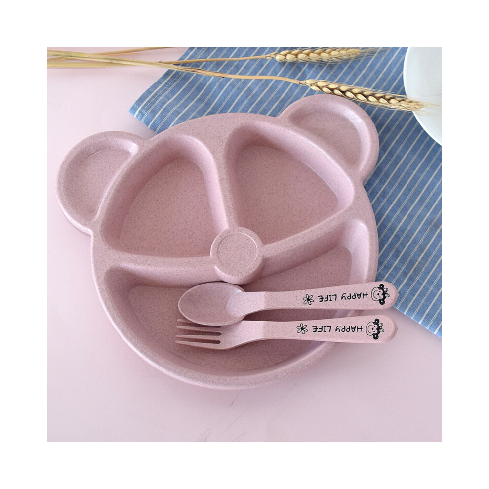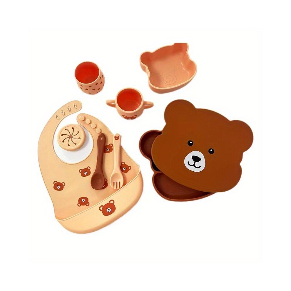 1 Set Bear Dinner Plate Set Baby Food Supplement Bowl Spoon Divided Grid Cartoon 8pcs Package Plate Childrens Silicone Tableware