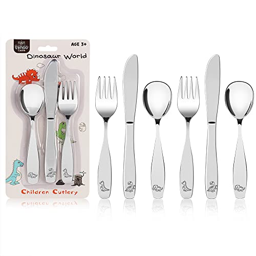 Lehoo Castle Dinosaur Toddler Kids Cutlery Set, Dino 6 Pcs Stainless Steel Travel Camping Baby Cutlery Sets - 2 x Forks, 2 x Spoons, 2 x Knives, Children's Dinner Knife and Fork Sets
