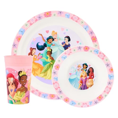 Disney Princess 3-Piece Polypropylene Children's Dinner Set – Plate, Bowl, and Tumbler Featuring Belle, Cinderella, Snow White, and Moana – Microwave and Dishwasher Safe – Suitable for Ages 36+ Months