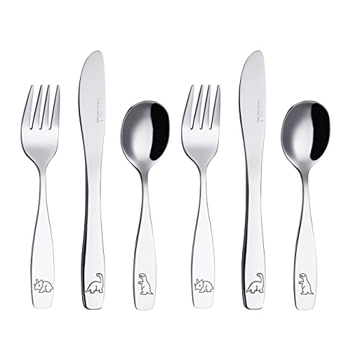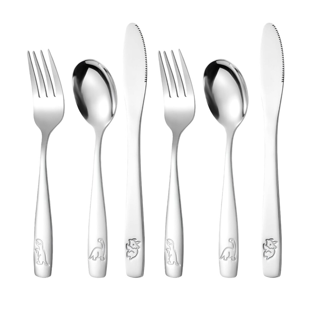 6pcs Childrens Cutlery Set Stainless Steel - Dinosaurs Toddler Kids Cutlery Set - Dishwasher Safe - 2 x Forks, 2 x Safe Dinner Knives, 2 x Table