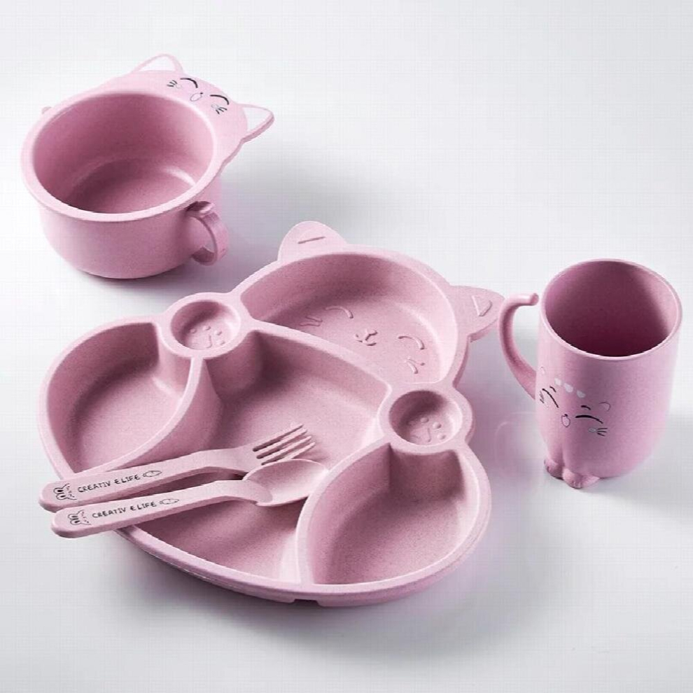 Childrens baby wheat straw cat dinner plate 5-piece set cartoon compartment lunch plate kindergarten drop-proof and environment