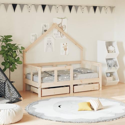 sephironlbb Children's Bed with Drawers, 70 x 140 cm, Solid Pine Wood, House Shape, Toddler Bed, Safe Cot Frame, Untreated Wooden Bed for Children's Room, Robust Furniture