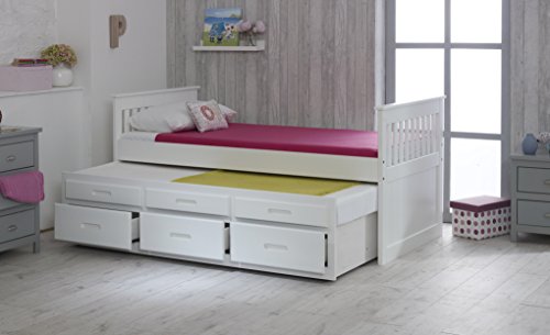 White Pine Single Bed with Trundle and Storage Drawers, Children's Captain Bed Frame in White, Space Saving Design