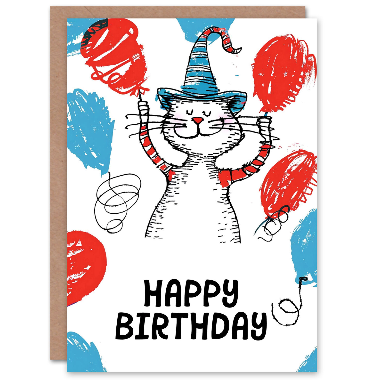 Birthday Card Cat Lover Balloons Hat Childrens Book Drawing For Child Kids