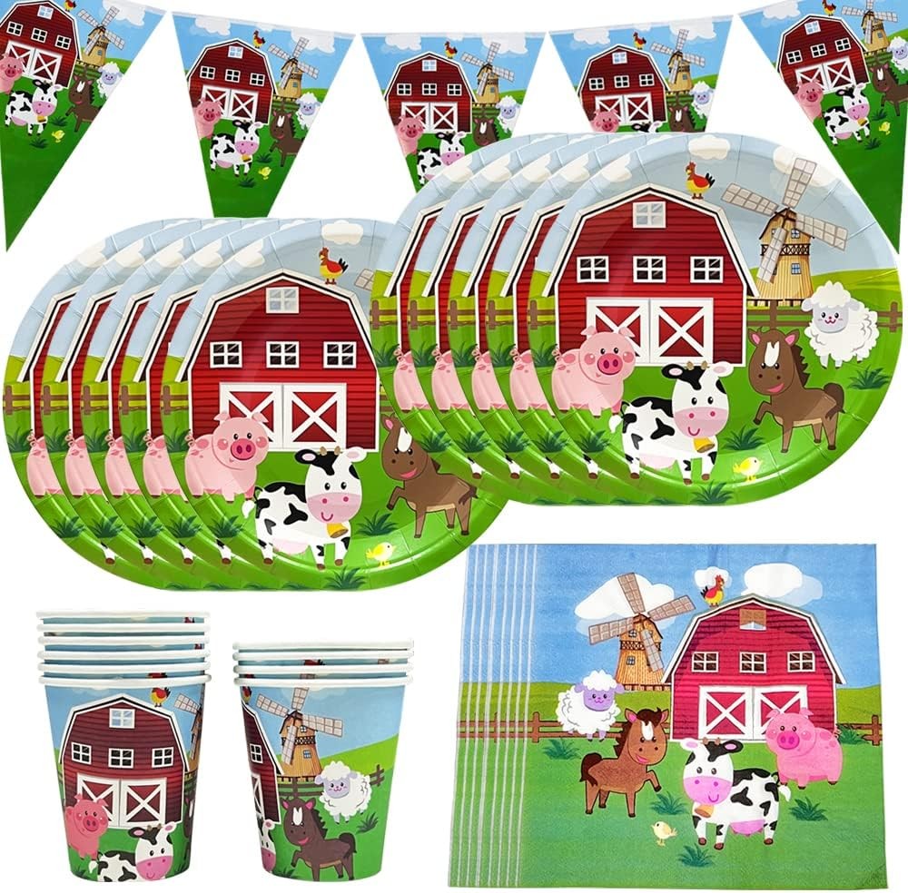Fuwraixis Farm animals party tableware, 61 piece Piglet and Cow children's birthday cutlery, Ranch theme party decoration supplies set, Includes paper cups, plates, napkins and tablecloths