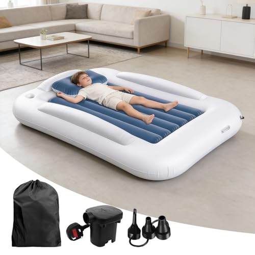 XJGQZ Inflatable Toddler Travel Bed with Pump & Carry Bag, Blow Up Kids Air Mattress with 3-Sided Safety Guards, Portable Children's Sleepover Bed for Home, Camping & Travel, Built-in Cup Holder