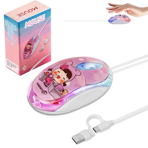 Mouse with Cable USB C & USB A 2-in-1 Wired Mouse with 7-Colour LED Backlight, 1.5 Metre Cable Mice, 1000D-PI Mini Quiet Click Computer Mouse for Children PC, Laptop, Mac, Windows, Pink