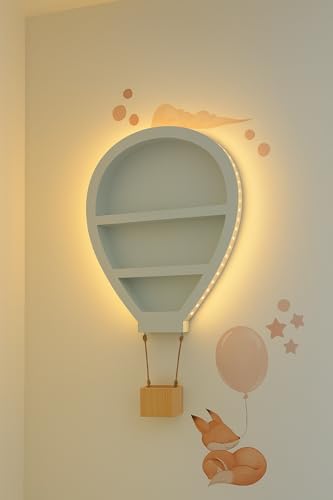 Garden Mile White Wooden Shelves, Children's Hot Air Balloon Shelf, Wall Mounted, LED Lights Shelving as Night Light Book Shelf Storage Unit Childrens Bedroom, Nursery Decor, Kids Shelving