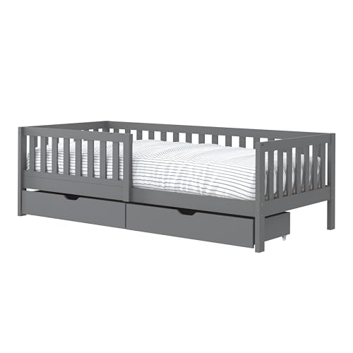 Sunny Isa Children's single bed, 2 drawers, grey | Safety barrier - Hybrid mattress 90x200 included (14 cm, hybrid foam, polyester cover) | Total dimensions: 206 x 98 x 65 cm