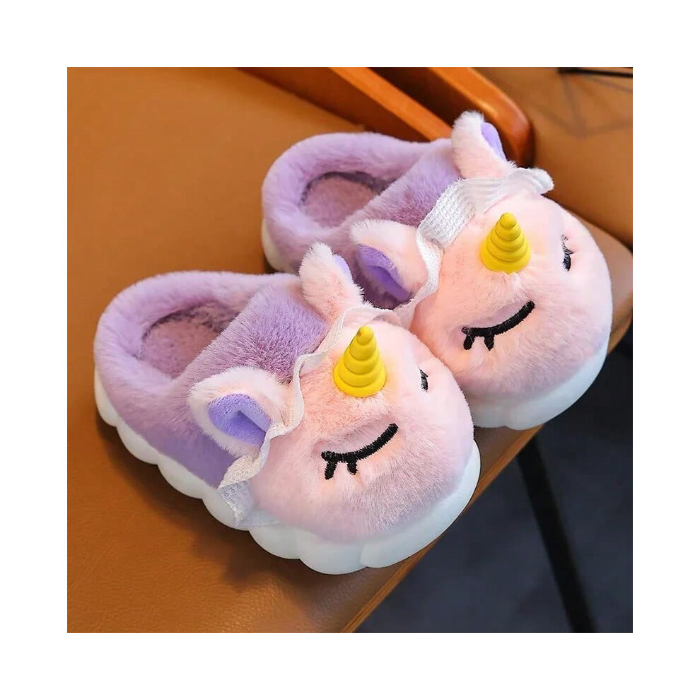 (Purple, 36-37 insole 22.5cm) New Winter Kids Plush Slippers Cartoon Unicorn Children's Indoor Slides Non-Slip Soft Mule Girls Boys Warm House Cotton