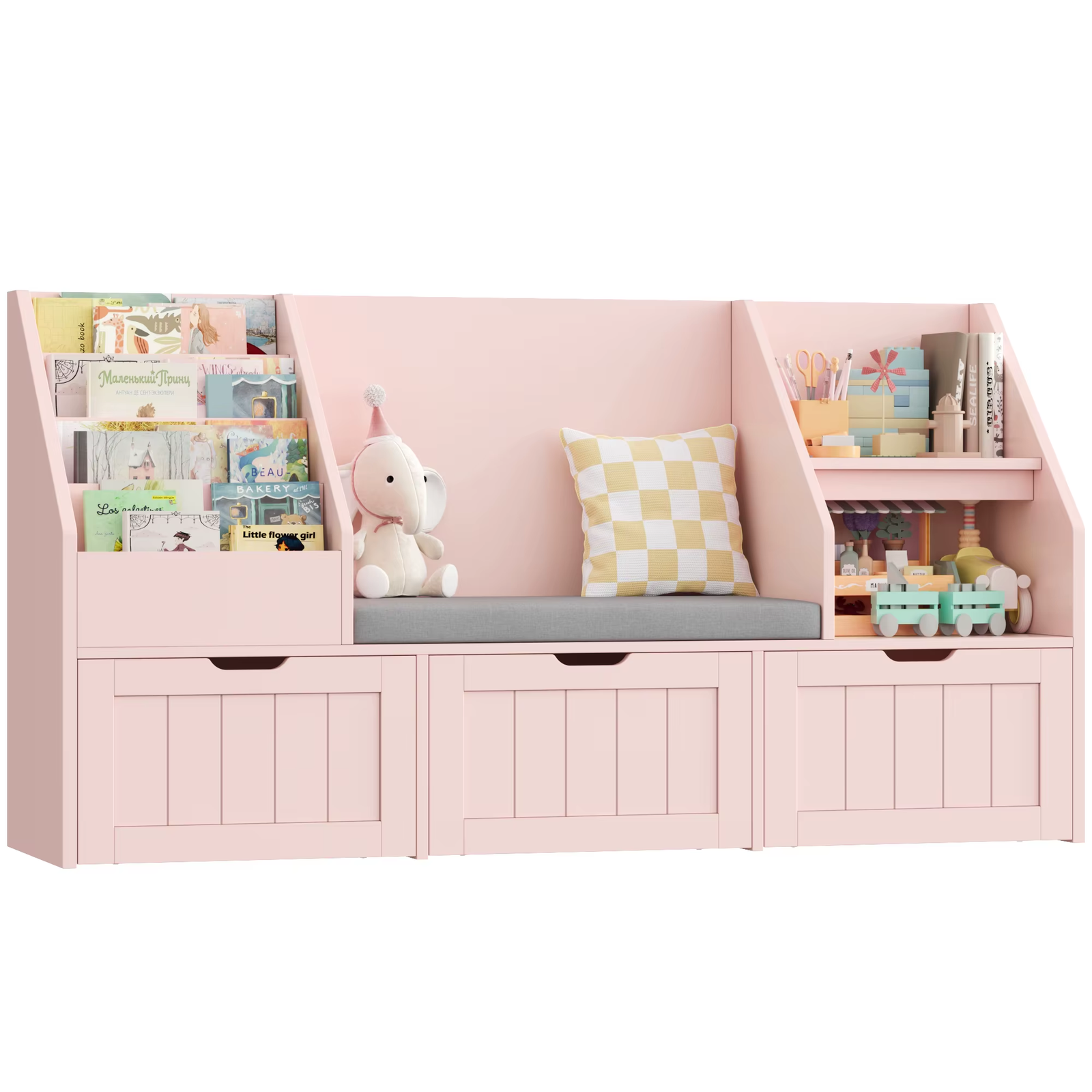 FOREHILL Kids Toy Storage Unit with Storage Bench 183.5cm Kids Bookshelf Toy Organiser Childrens Bookcase, 3 Drawers on Wheels, 7 Open Shelves for Playroom Nursery Furniture Pink